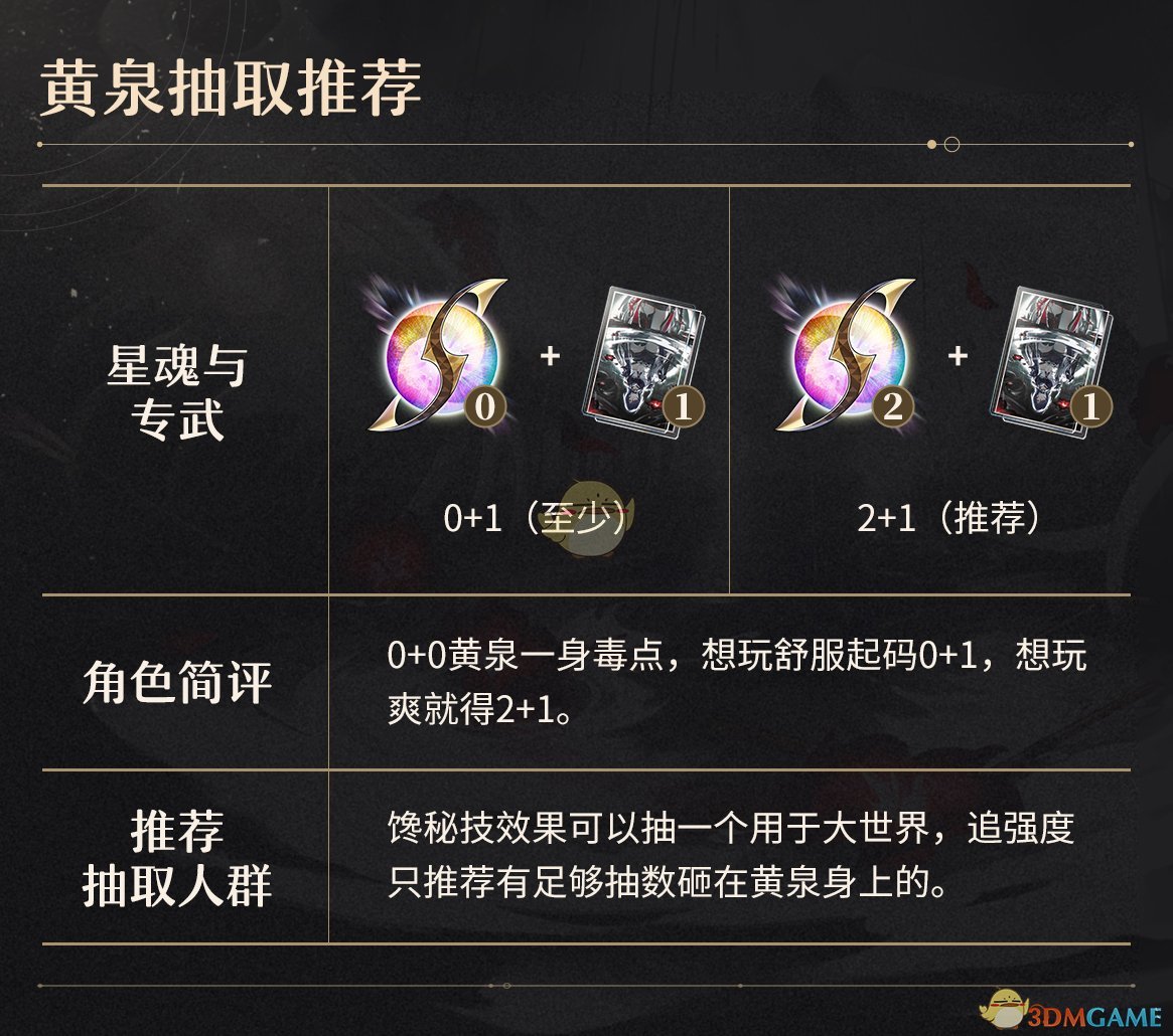专武自带36%暴伤和终结技增伤还有叠层功能,性价比上爆杀了一魂单调的18%暴击率。因此现在的黄泉普遍是推荐至少0+1的。如果想决战3.0的话倒是考虑2+1,解除配队限制,更容易喝到汤。