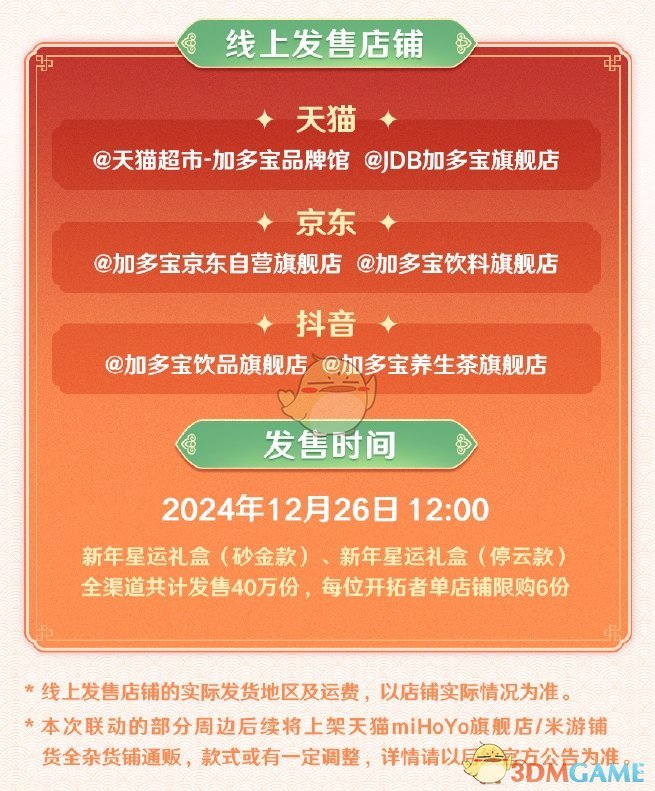 1、新年星运礼盒(砂金款)、新年星运礼盒(停云款)全渠道共计发售40万份,每位开拓者单店铺限购6份;
