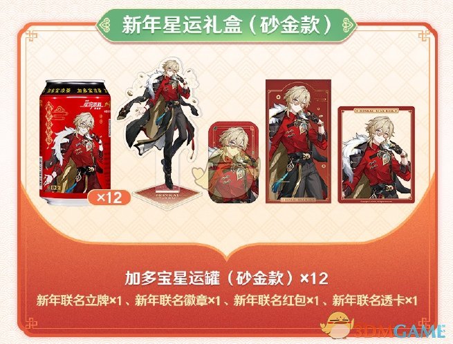 加多宝星运罐(砂金款)x12新年联名立牌x1、新年联名徽章x1、新年联名红包x1、新年联名透卡x1