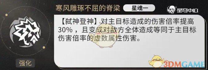 - 1星魂:万敌机制改变,输出伤害更高,打三个深渊都比较舒适。战斗开始时,万敌暴击率提高,数值等同于其生命上限一定比例;使用战技或终结技时,对主目标周围敌人造成额外伤害,提升对单和对群输出能力 。