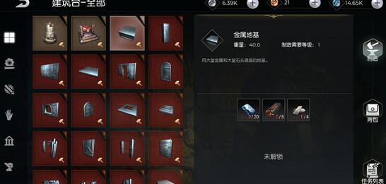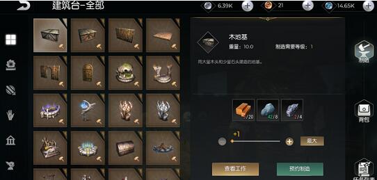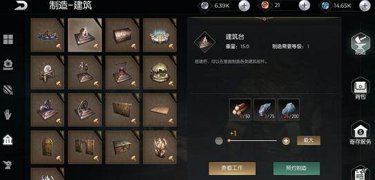 2、接着我们在背包中找建筑台图纸,使用木头、石头、金属矿石即可打造建筑台。