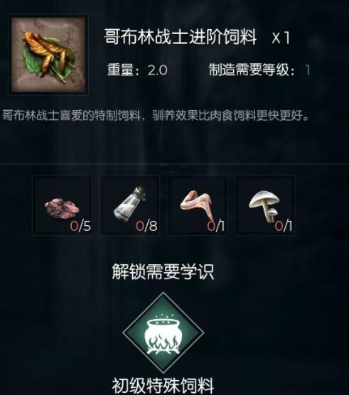 哥布林战士:肉饲料:225 盐:360 白蘑菇:45 秃鹫羽翅:45(铺助驯养宠物目标星级越高野性值掉的越多,无伤害。推荐2.5分)