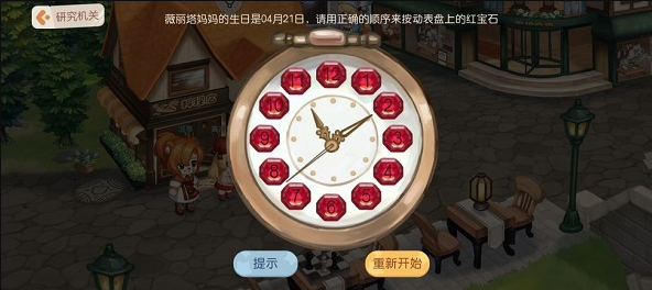 1.提示:薇丽塔妈妈的生日是04月21日,请用正确的顺序来按动表盘上的红宝石;