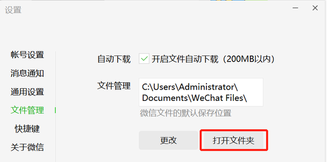 2、然后微信打开【设置】——【文件管理】——【打开文件夹】。