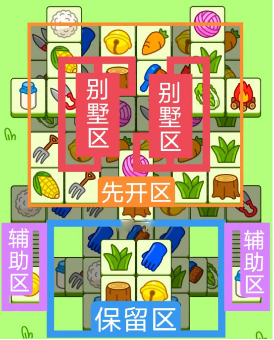 2.开局先消除橙色区的牌,这里压牌。尽量要让牌面保持在同一水平面,然后一层一层消除表面牌,不要跨层太多拿牌,等表面牌消除完后,以大别墅内互相消除为主。