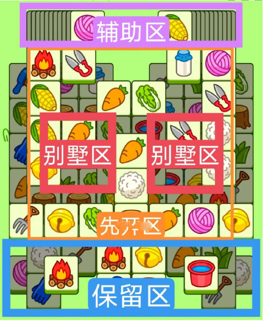 3.必要时可以用紫色盲盒区辅助消除,盲盒区后期不用留太多,留几张备用即可。