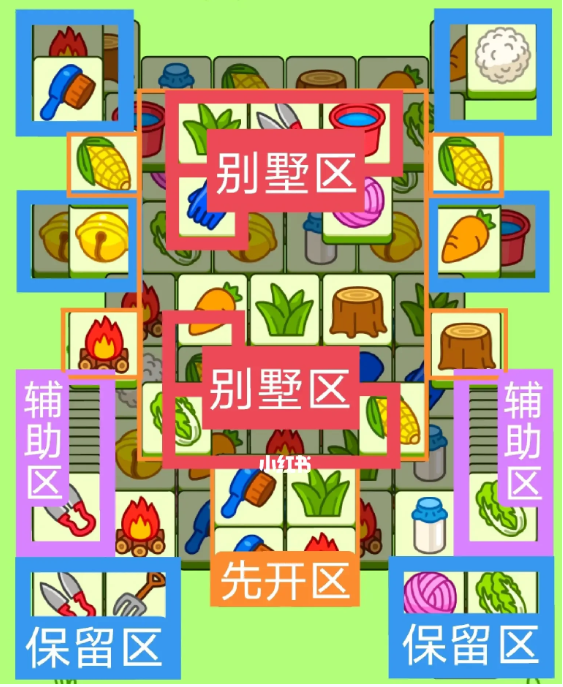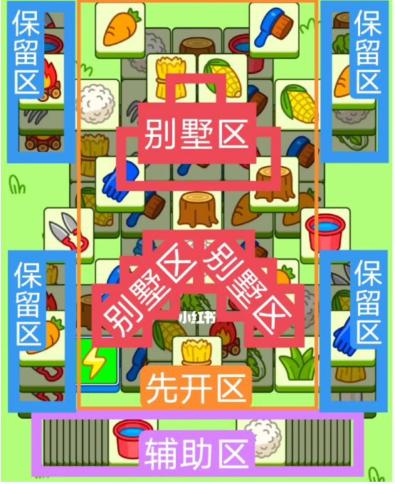 一个三角形大别墅,两个斜着的长形别墅。开局先消除橙色区,然后按照一层层均匀消除表面牌,哪里压牌比较多就先消除哪里,必要时可以用盲盒区辅助消除表面牌,尽量还是以别墅区内互相消除为主,蓝色区有叠牌,但是不多, 全部保留到后期使用。