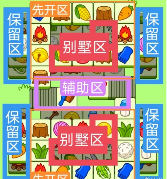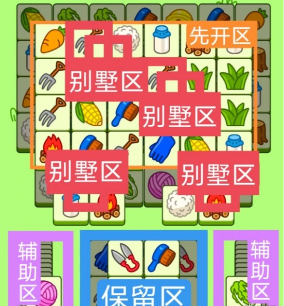 两个直角形大别墅,两个小三角形别墅,开局先消除橙色区,然后按照一层层均匀消除表面牌, 哪里压牌比较多就先消除哪里,必要时可以用盲盒区辅助消除表面牌。尽量还是以别墅区内互相消除为主。蓝色区有叠牌,但是不多,全部保留到后期使用。