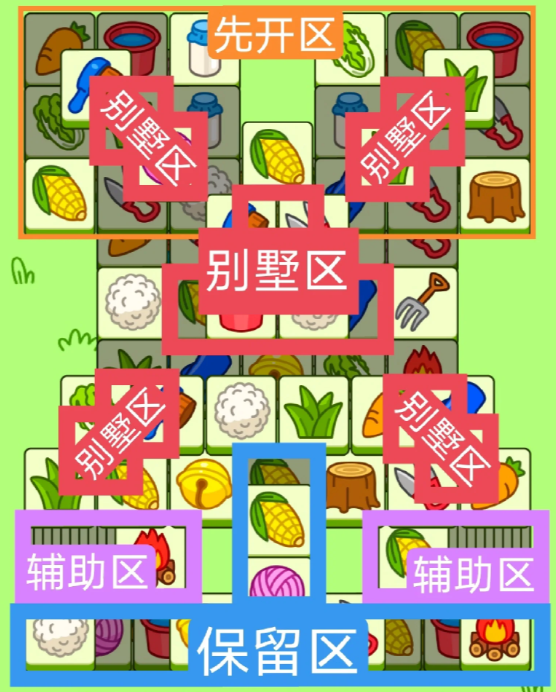 一个十字形大别墅,一个方形大别墅,开局先消除橙色区,然后按照一层层均匀消除表面牌, 哪里压牌比较多就先消除哪里,必要时可以用盲盒区辅助消除表面牌。尽量还是以别墅区内互相消除为主。蓝色区有叠牌,但是不多,全部保留到后期使用。