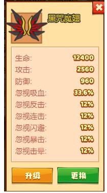 2、先给大家说一下这关的通关需求吧,咱们首先得根据boss的技能特性选择相应的翅膀。以及神器、宝石、坐骑等。这里小编就给大家展示翅膀了。上面boss技能属性也介绍了,高连击高吸血高闪避。所以我们的偏向点便是这三个。
