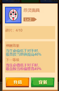 2、这个叫做怨灵面具的神器走吸血流的玩家使用这个神器还是挺厉害的,这个神器的效果为当生命值低于对手时,吸血属性按照当前值提高百分之四十。三级的面具基本上就增加一半属性了。后期吸血属性破百简直不要太轻松。只是这个确实不怎么好发展。试炼塔的boss两百关往后基本都是三百四百的忽视吸血。所以这个流派的玩家还是比较少的。