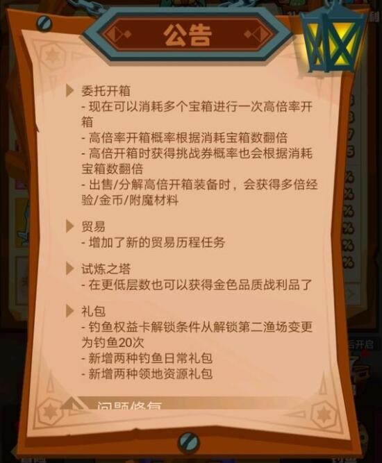 这一次即将更新的主要内容有关于神器、宝石、委托开箱、贸易、试炼之塔和钓鱼模式,并且官方大大还修复了一些小问题的bug,接下来我们一起来看看详细的内容吧;