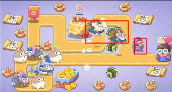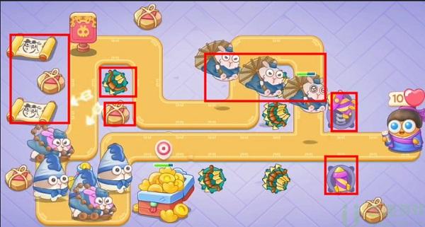4、此时玩家多安放两个导弹塔来放空,然后在左侧安放一个分裂弓,利用分裂弓将左侧的图清除即可。