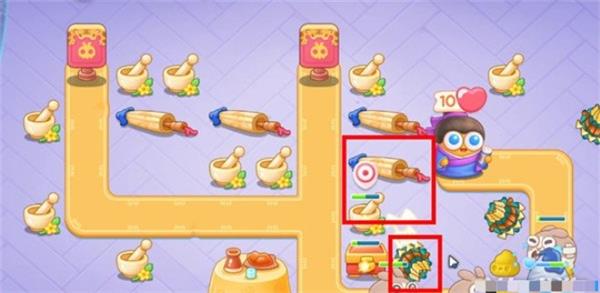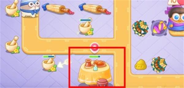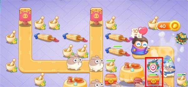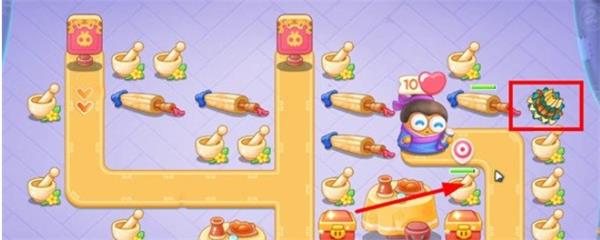 3.宝箱打出的道具是减速道具便便塔,随即锁定左侧的桌子,有钱了就将场上的炮塔升级。