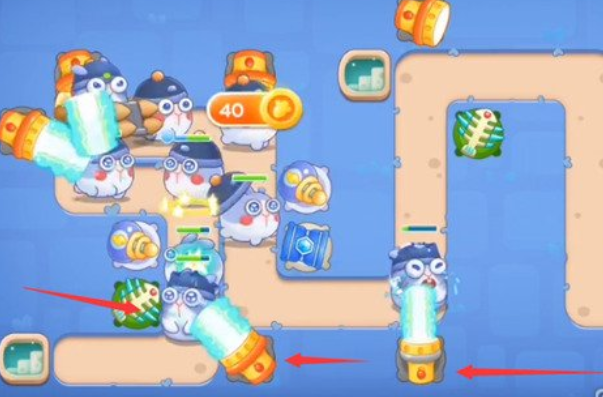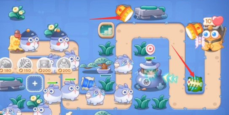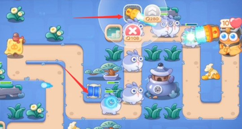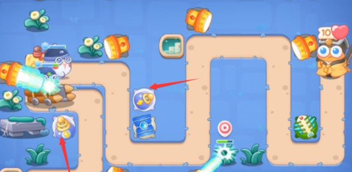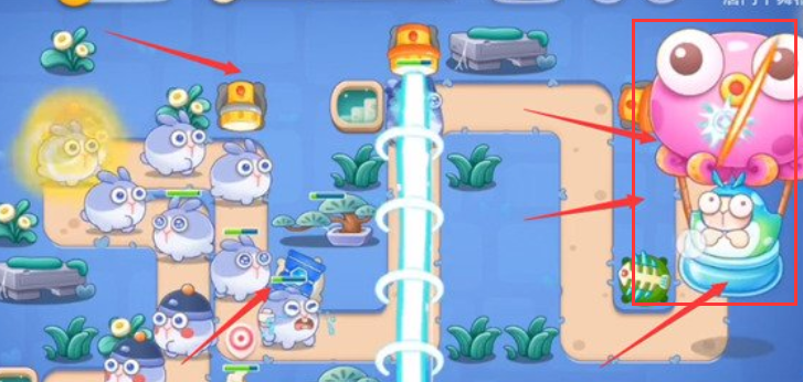 2、在图中箭头处的位置分别放置一个冰锥塔和一个手电筒,冰锥塔的双向攻击可以在攻击兔子的同时顺便将障碍物清理掉,而手电筒则能配合第一个手电筒将第一波的兔子全部清理干净。