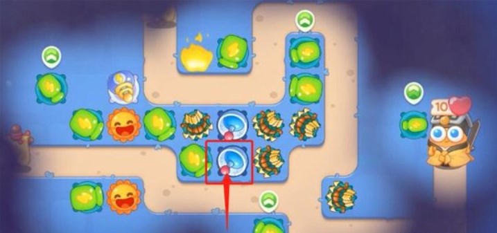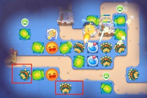 5、第五、六波上方加一瓶子塔,左侧加一鱼雷升满级,左侧再加三瓶子塔,中间加一蓝色塔,道具全清。