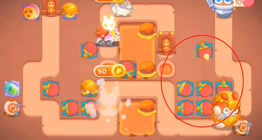 4、之后boss会往右边走我们要将右边建满建筑,如图所示有钱就升级。