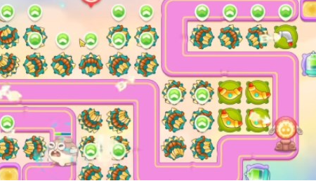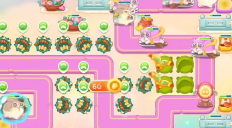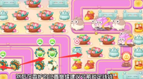 1、开局在左下角位置放多重箭,先把旁边的小道具打掉,再放多重箭,等兔子从左下角路口出来之后打兔子,往右侧继续清理,可以直接锁定,就能打到兔子,打完道具放多重箭。