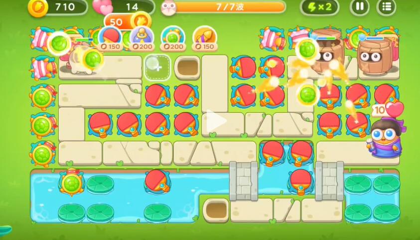 1、开局之后使用乌龟打左边的建筑,获得金币给乒乓球升级消灭兔子。