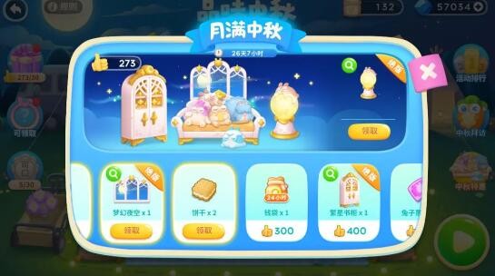 获得一定量的活动积分,可以在月满中秋中领取绝版家具【梦幻夜空】、【繁星书柜】,以及关卡道具、呆兔食物、兔子票等。达成20关固定关卡全金萝卜,将获得绝版家具【抱抱月球】!天上的月亮阿波没有,但是阿波可以送你一个家里的月亮=3=