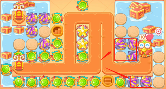 1、开局我们在图示位置放置两个满级乌龟,等水中出现木板之后继续放置乌龟,优先把箱子打出来给的是星星。