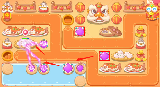 2、水中打出位置就放置一个魔法球,升二级就可以了,然后把左边位置的道具全部清理完,继续放置魔法球。