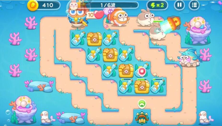 2、在最左侧的珊瑚边上建造多重箭补刀兔子,在宝箱右侧建造元宝,和多重箭一同进行输出,摧毁宝箱可以获得章鱼。