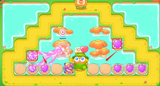 2、我们要在最靠近萝卜的两侧放置导弹,路线沿线防止魔法球,这里的飞行兔子是一根直线下来的。