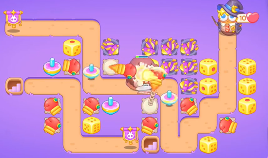 3、慢慢向右边开图,放置更多的炮台来清理终点位置的大道具,尽快拿到全清,注意有飞行兔子所以要用到导弹。