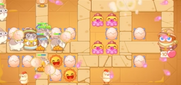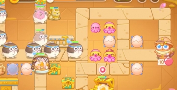 3、将右侧道具清除后,补充一个满级蛋壳,将中间的宝箱清除后会获得一个章鱼炮台。