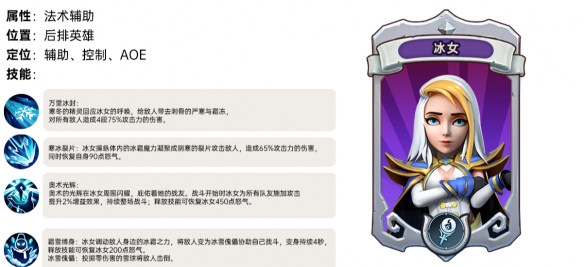 提升2%增益效果,持续整场战斗;释放技能可恢复冰女450点怒气。