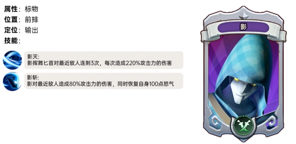 影挥舞匕首对最近敌人连刺3次,每次造成220%攻击力的伤害