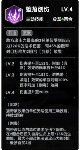 二技能:对对方攻击力最高的3名单位造成伤害的同时,满级还附加54%的沉默2回合,同时对减速的单位100%附加剧毒效果。这简直无敌,二回合的沉默还是对方输出最高的3位,可想而知这恐怖性。