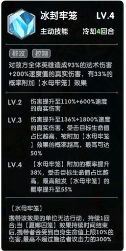 夏娜的二技能:冰封牢笼,实打实的控制,水母牢笼可以让对方单位无法行动一回合,可想而知,若是我们夏娜速度快,则对方的输出位在二回合打不出输出,而我方可以打输出,优势持续扩大,有机会在二回合我们就把对面输出位干掉,让其输出缺失,奠定胜局