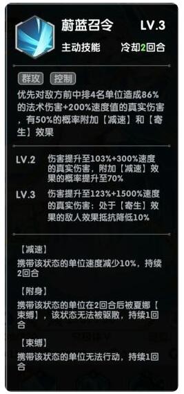 一技能:蔚蓝召令。主要是给敌方造成伤害的同时还附加减速效果,减速后相当于我方加速。