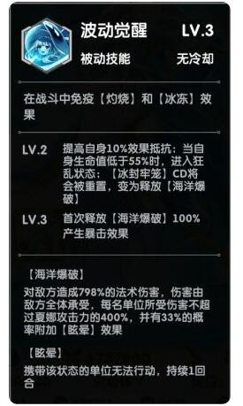 被动:波动觉醒,自身是免疫灼烧和冰冻的,且在生命低于55%时,直接进入狂乱状态,简单点来说就是下次技能直接打出海洋爆破,伤害高且33%几率附加眩晕。这为阵容的控制上了一个档次。