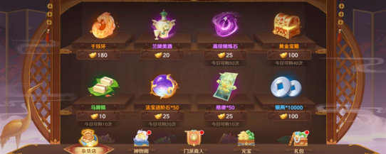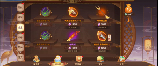 法宝:遇到上阵的神将的法宝就买了吧,无论紫晶还是元宝,都买入;适当用紫晶买入一些法宝进阶石