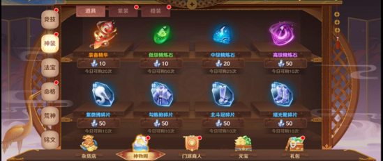 神装:每天都必须购买装备精华。玄铁有富余就购买:低级精炼石、中级精炼石、高级精炼石