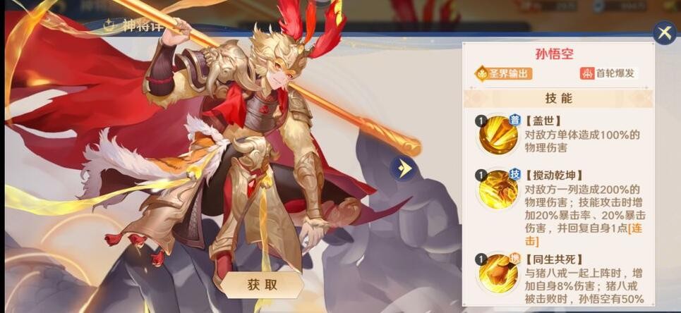 突破+11后可以为所有上阵圣界神将增加伤害,突破+5后能为队友回血,释放技能帮自己回怒,跟猴哥一起上场能为猴哥回复连击点。