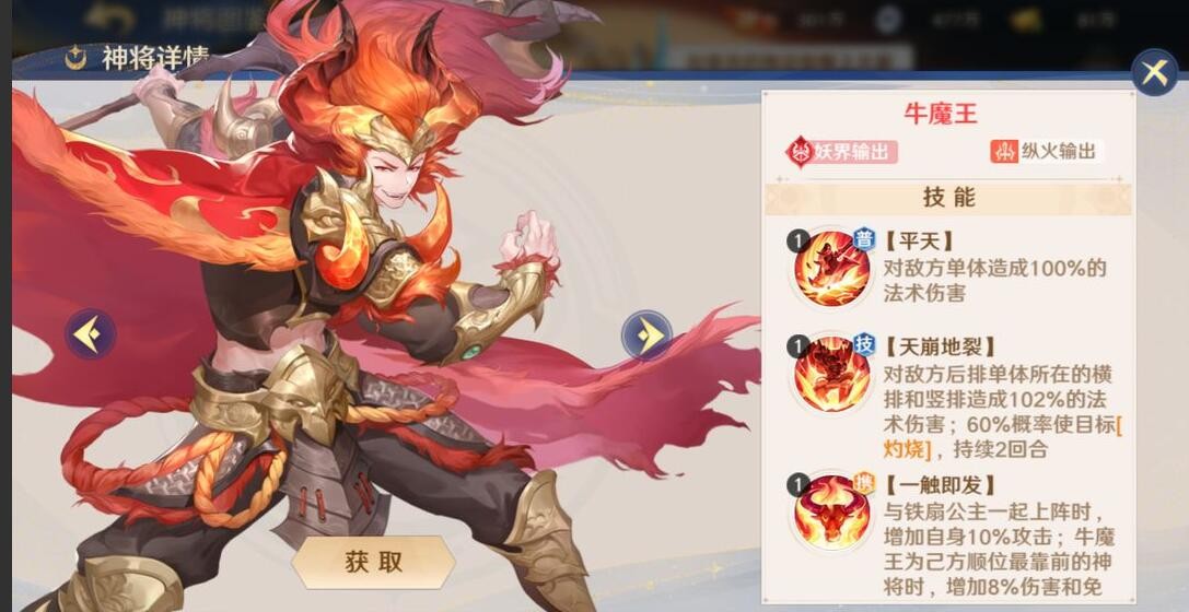 牛魔王的纵火针对4个目标(攻击对象+后排),法宝最高能带来全体灼烧,让对方处在火海之中。在前排触发免伤也可以当作半肉来抵挡对方伤害,又肉又能辅助又有伤害。