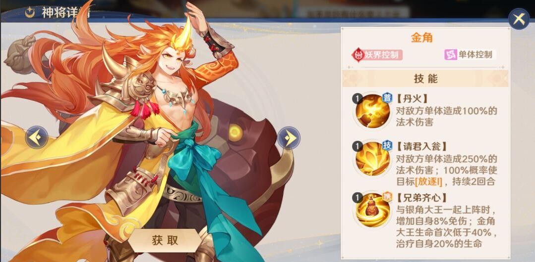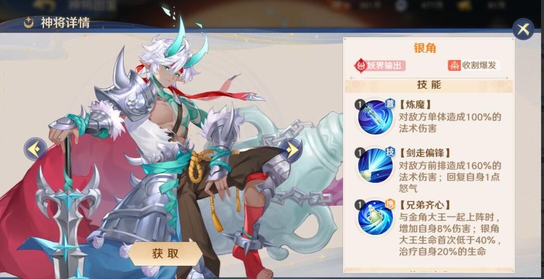 妖界的纯输出橙将不多,银角一般会在前期抽卡中获得。银角除了前排攻击以外,击败目标还可以达到溅射效果,突破+5还可以再一次免怒技能,攻击有灼烧Buff的敌军伤害加成,前排消耗或者后排收割都非常可观!