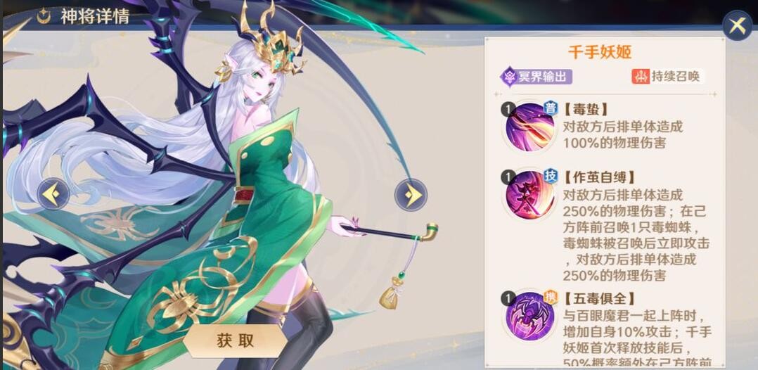 经过多次尝试,首个橙将是和主角同阵营的可以直接使用。如果前期能抽到蜘蛛那么就着力培养,提升品质后输出增强,蜘蛛数量增加,变相成为后排AOE、防前排攻击(单体最高可防三次)