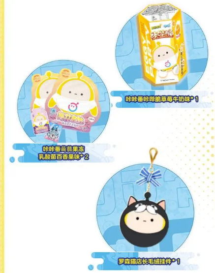 2、礼盒内容:罗森猫店长*1、咔咔番咔哔脆草莓牛奶味*1、乳酸菌百香果味*2、罗森猫店长毛绒挂件*1。