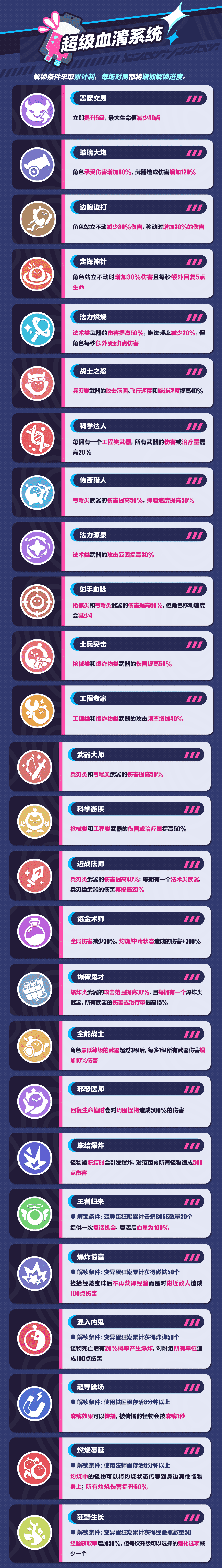 深入了解全新机制,为最终胜利提供充分保障!蛋仔可通过玩法入口,点击【变异蛋狂潮2.0】来查看玩法说明、游戏图鉴与玩法成就。在游戏图鉴中,蛋仔可以知晓职业、技能与超级血清的详细介绍及解锁条件。