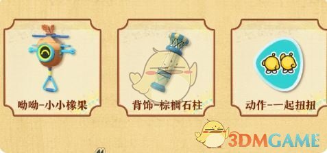 1、奖励包括:呦呦-小小橡果、背饰-棕榈石柱、动作-一起扭扭。