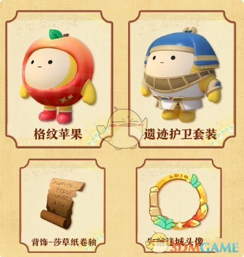 1、奖励包括:格纹苹果、遗迹护卫套装、背饰-莎草纸卷轴、失落迷城头像框。