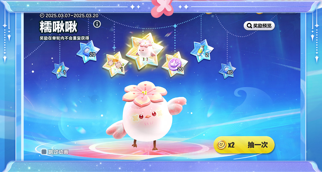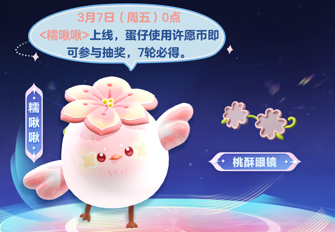 3月7日(周五)0点<糯啾啾>上线,蛋仔使用许愿币即可参与抽奖,7轮必得。