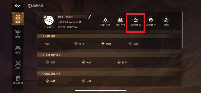 3、点击自己个人信息旁边的返回登录,这个操作可以在用一个账号下切换角色。