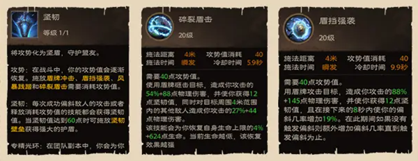4、战盾的核心还是规避伤害,但是两个技能规避伤害的方式不同,一个有aoe和回复,还有一个是偏斜状态。
