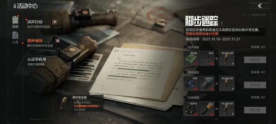 【脚步迷踪】限时活动于11月19日上线,先锋们参与【脚步迷踪】活动,在单局内收集到相应的材料,便可在活动页面兑换脚步发生器。值得一提的是每人每日兑换数量有限,先锋们若需求量较大 ,活动期间还可在市场中直接购买。